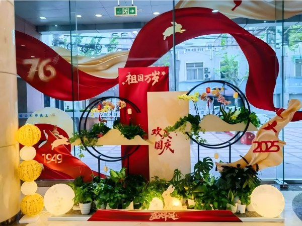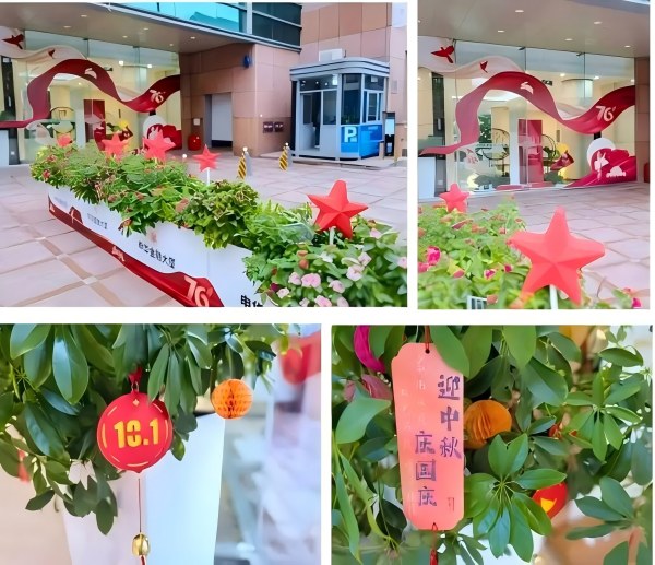双节同庆绘新景,大道如砥启新程。在中华人民共和国成立76周年与传统中秋佳节到来之际,为营造浓厚节日氛围,传递家国情怀,申华金融大厦对公共区域进行主题布置,以庄重雅致之景,向祖国献礼、为同仁送福。
